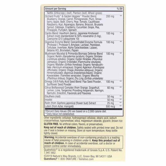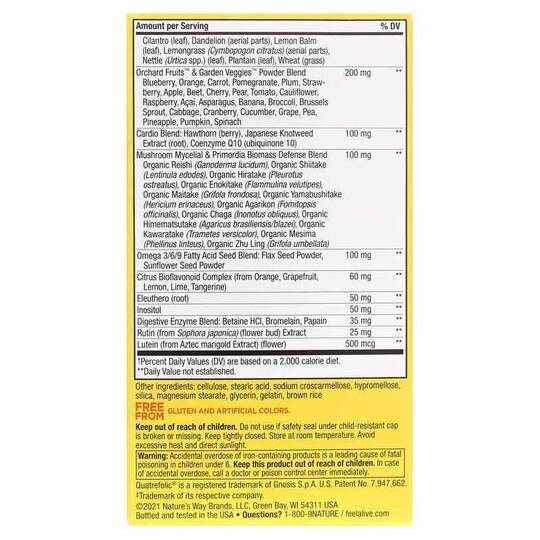 As with all Alive! multivitamins they are also packed with high potency B-vitamins, 26 fruits and vegetables and nutrients for whole body nourishment to help support bone health, daily energy, colon health, eye health, heart health, and immune defense.