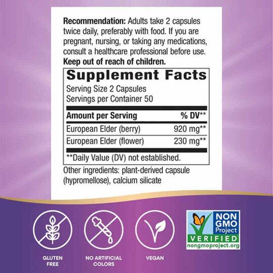 Black Elderberry from Nature’s Way is a dietary supplement that works to support immune system health and offers antioxidant support to protect cells from damaging free radicals. Found mainly in Europe and North America, black elderberries have dark, blackish purple berries that grow in clusters. These berries have been used for many years to support the immune system and for seasonal health challenges, as well as a food source for making wine and syrup.