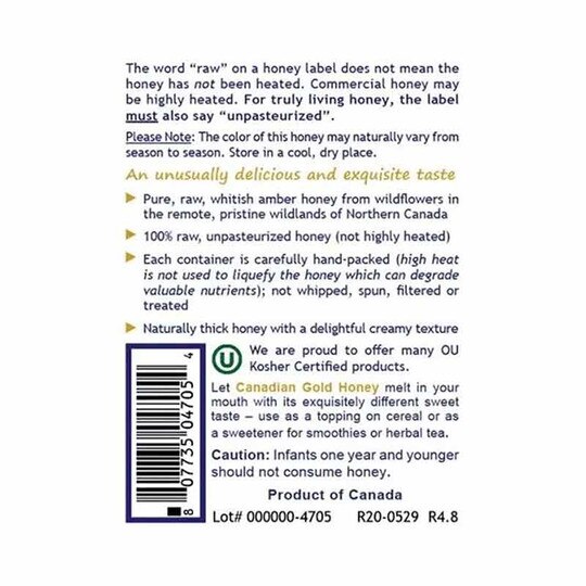 - Pure, raw, whitish amber honey from wildflowers in the remote, pristine wildlands of Northern Canada