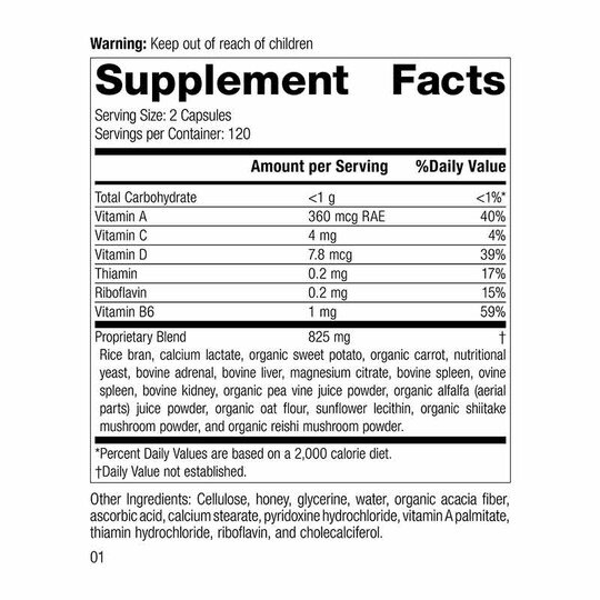 - Rice bran, calcium lactate, organic sweet potato, organic carrot, nutritional yeast, bovine adrenal, bovine liver, magnesium citrate, bovine spleen, ovine spleen, bovine kidney, organic pea vine juice powder, organic alfalfa (aerial parts) juice powder, organic oat flour, sunflower lecithin, organic shiitake mushroom powder, and organic reishi mushroom powder.