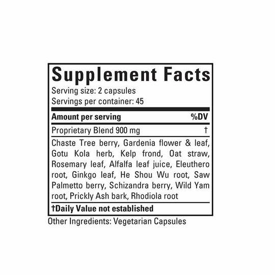 - Mood Stabilization and Mental Clarity: Chaste Tree and Schizandra berries are key components in supporting hormone balance and emotional stability. These botanicals may help regulate mood swings, reduce irritability, and promote a calm, balanced state of mind. Gotu Kola herb, Ginkgo leaf, and Rosemary leaf are renowned for their neuroprotective properties, which support memory, focus, and cognitive function. These ingredients support blood flow to the brain, promoting optimal mental performance and clarity.