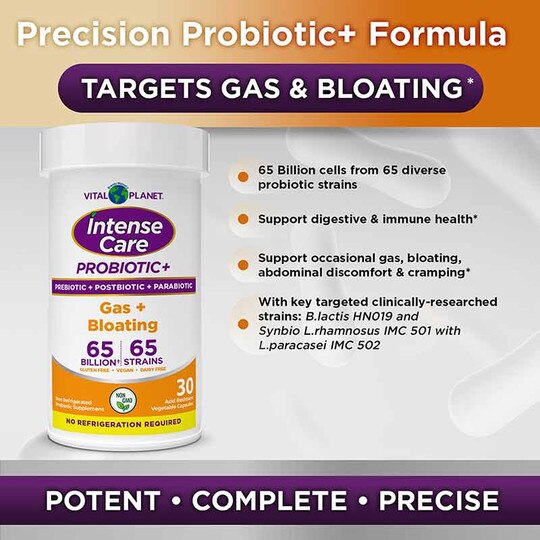 Vital Planet Intense Care Probiotic Gas + Bloating is formulated with targeted bacterial strains and supporting ingredients to promote digestive health and comfort. The acid-resistant capsule technology helps deliver active ingredients to the digestive tract, where they promote microbiome balance.