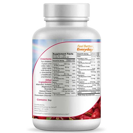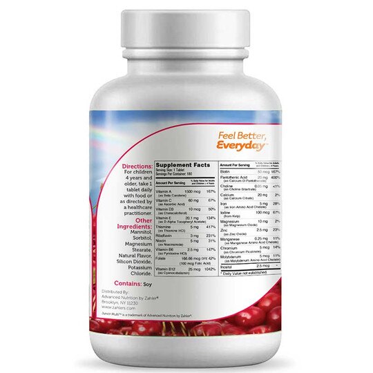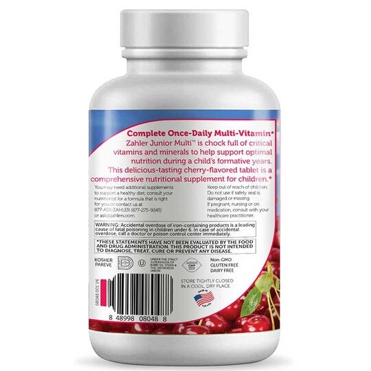Junior Multi from Zahler is a children's multivitamin chock full of critical vitamins and minerals, recommended by today's leading researchers, to fill in the gaps of the most prevalent nutritional deficiencies. Junior Multi contains the right combination of 23 essential nutrients in a delicious-tasting, all natural cherry-flavored tablet. It gives growing children the nutritional boost they need to maintain a healthy mind and body.