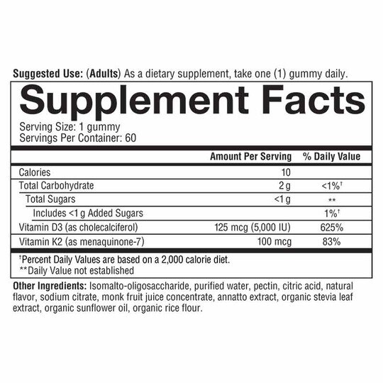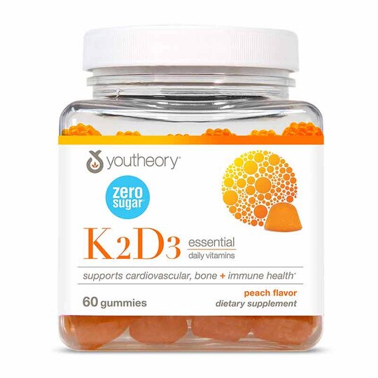 Youtheory® K2D3 combines Vitamin K, which has well-established roles in promoting normal bone mineralization and cardiovascular health, with Vitamin D, which is responsible for ensuring the absorption and retention of calcium. Both are essential nutrients that enable the body to properly use calcium for a variety of functions in normal metabolism—all in a delicious peach flavor gummy with zero grams of sugar!