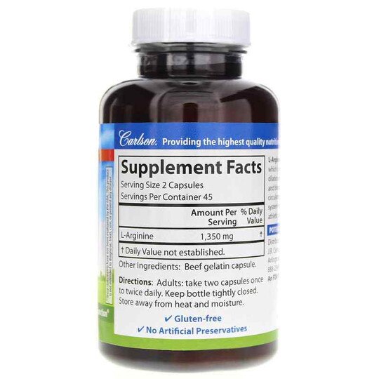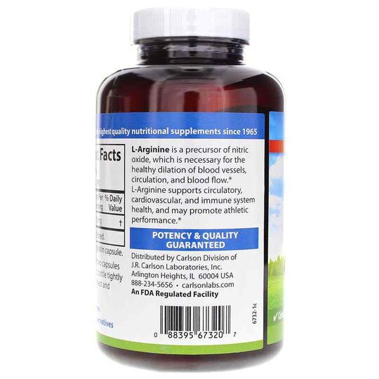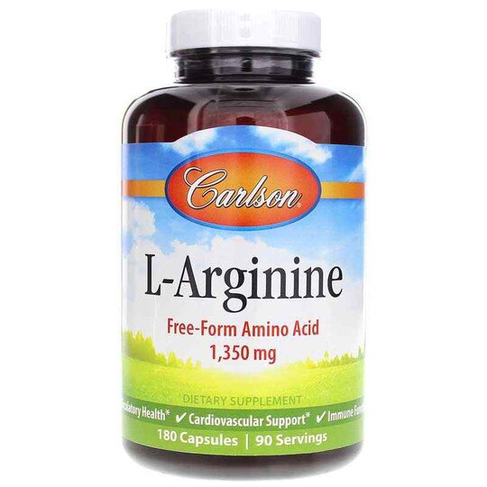 Carlson L-Arginine is a precursor of nitric oxide, which is necessary for the healthy dilation of blood vessels, circulation and blood flow. L-Arginine supports circulatory, cardiovascular and immune system health, and may promote athletic performance.