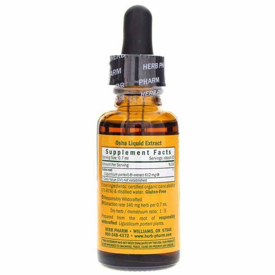 Herb Pharm OSHA Liquid Extract is an herbal supplement that provides traditional support for the respiratory system. Herb Pharm prepares their Osha extract from the root of responsibly wildcrafted Ligusticum porteri plants.