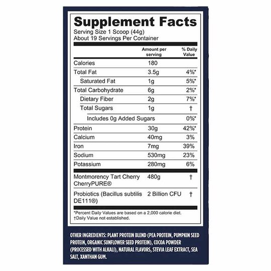 Other Ingredients: PLANT PROTEIN BLEND (PEA PROTEIN, PUMPKIN SEED PROTEIN, ORGANIC SUNFLOWER SEED PROTEIN), COCOA POWDER (PROCESSED WITH ALKALI), NATURAL FLAVORS, STEVIA LEAF EXTRACT, SEA SALT, XANTHAN GUM.