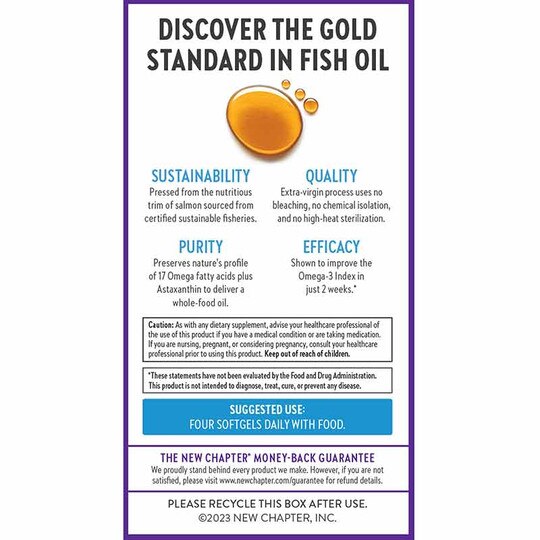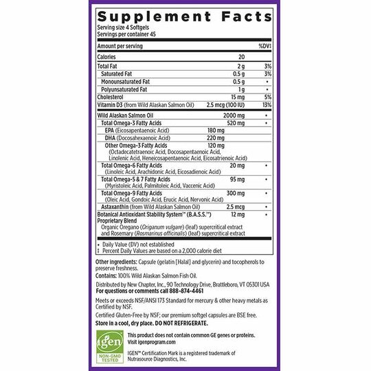 New Chapter's Wholemega fish oil is a naturally pure, extra-virgin, whole-food alternative to heavily distilled fish oil pills in which processing can isolate and reduce beneficial compounds. Unlike typically processed fish oil that may be high-heat sterilized and bleached, theirs is fresh-pressed for absorption using a gentle, food-grade process that preserves Wild Salmon’s 17 Omega fatty acids so you can get the whole profile of good fats from this natural superfood.